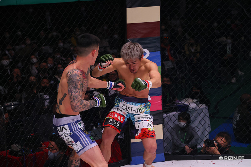 1 パンチを当てて昇侍(右)をダウンさせる萩原