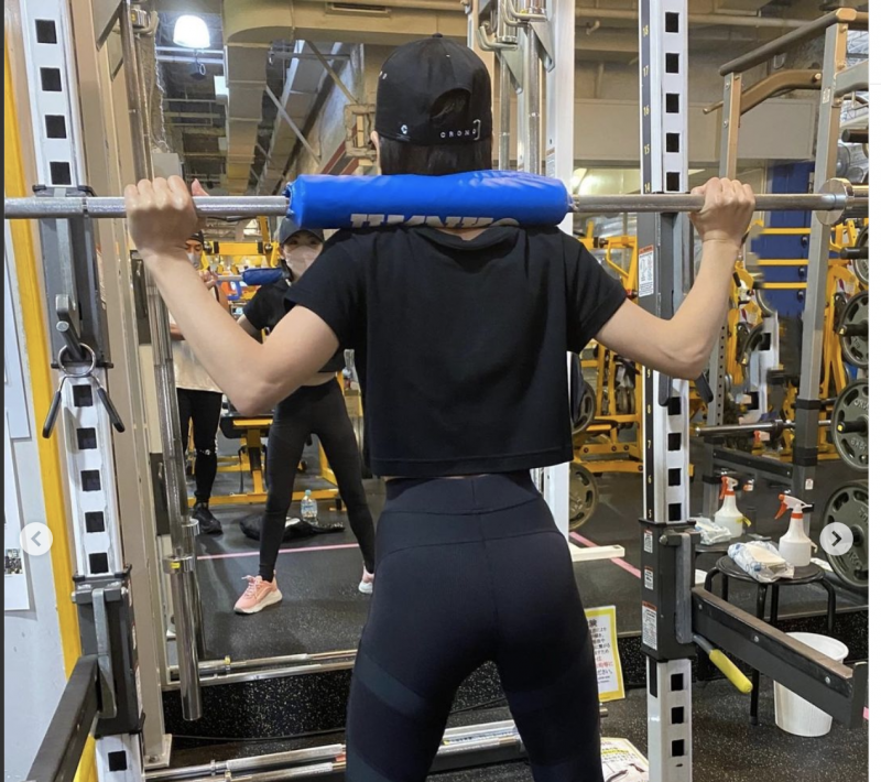 矢沢がスクワット、鏡には厳しいトレーナーの魔裟斗が映る(矢沢心インスタより)