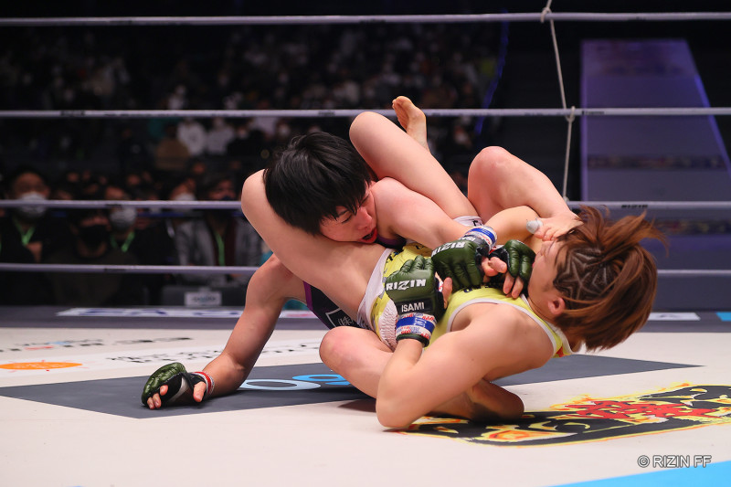 伊澤が得意の寝技、下からの三角絞めで浜崎を苦しめる瞬間