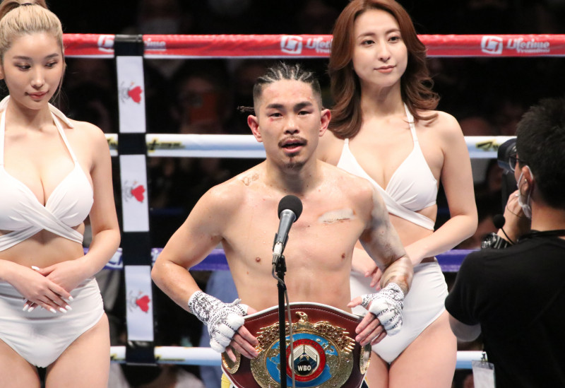 ベルトを巻く井岡、グラマラスなラウンドガールが華を添える