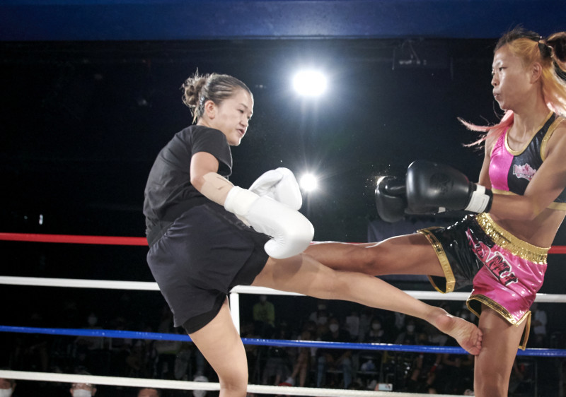 フェフ姉さん(左)のローキックと対戦相手のローキックが同時にヒット