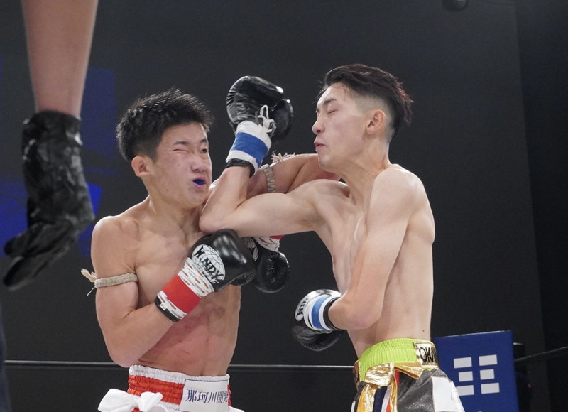 平松(右)が寿来にヒジ打ちを見舞う
