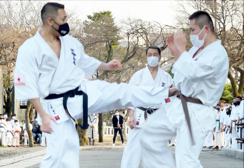 奉納組手では、昨年の全日本大会決勝戦の顔合わせとなる入来建武(左)と多田成慶が行なった。(c)shinkyokusinkai