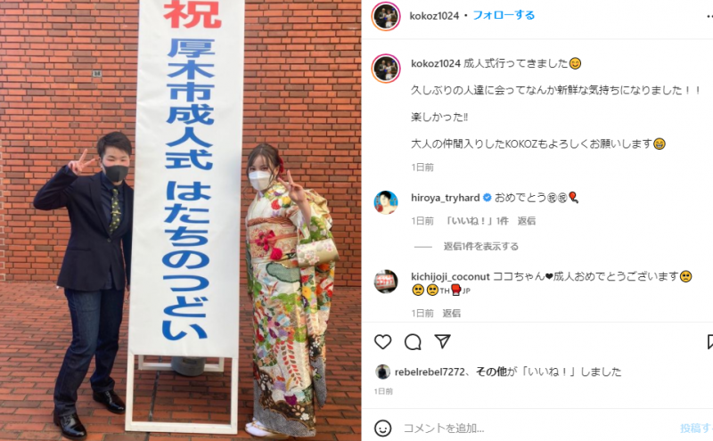 KOKOZ(左)がインスタグラムに掲載した黒のスーツ姿