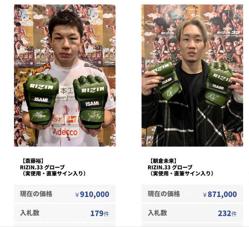 斎藤のグローブが、オークション91万円の最高額、朝倉未来は87万1000円だった。(HAT TRICK公式サイトより)
