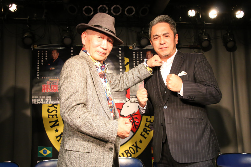 藤原祭復活で藤原敏男が燃えている。パンチを受けるのは、リングアナとして参加する宮田充KNOCK OUTプロデューサー