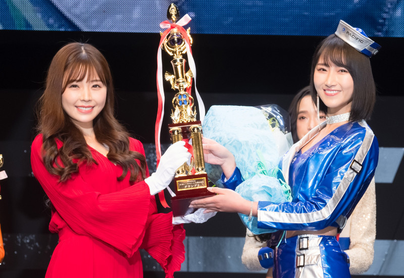 『日本レースクイーン大賞2021』で19年度グランプリで元RIZINラウンドガールの川村那月(左)が21年度グランプリでK-1ラウンドガールの川瀬もえにトロフィーを手渡した