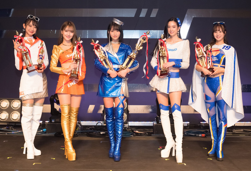 日本レースクイーン大賞2021大賞の5名。すべてラウンドガール経験者:左から相沢菜々子、今井みどり、グランプリの川瀬もえ、太田麻美、安田七奈