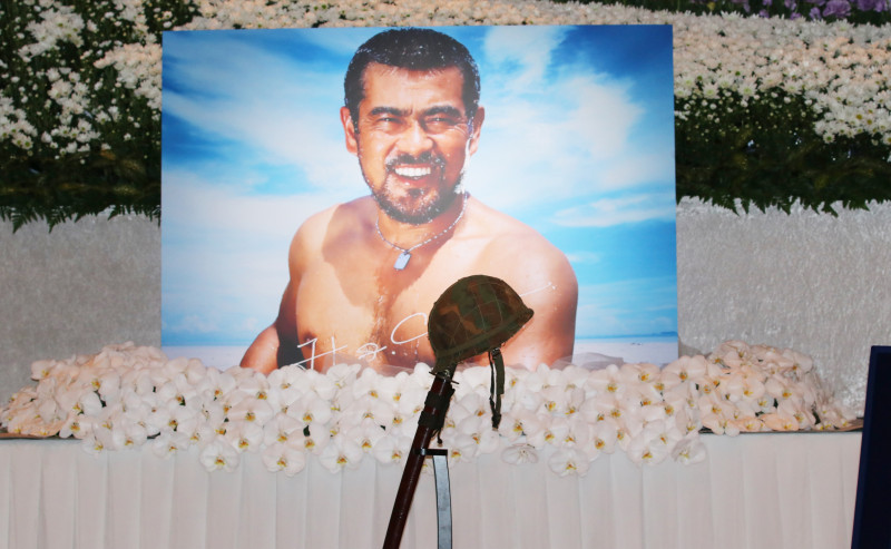 会場の遺影には『戦国自衛隊』での写真、その前には日本刀とヘルメットが飾られた。