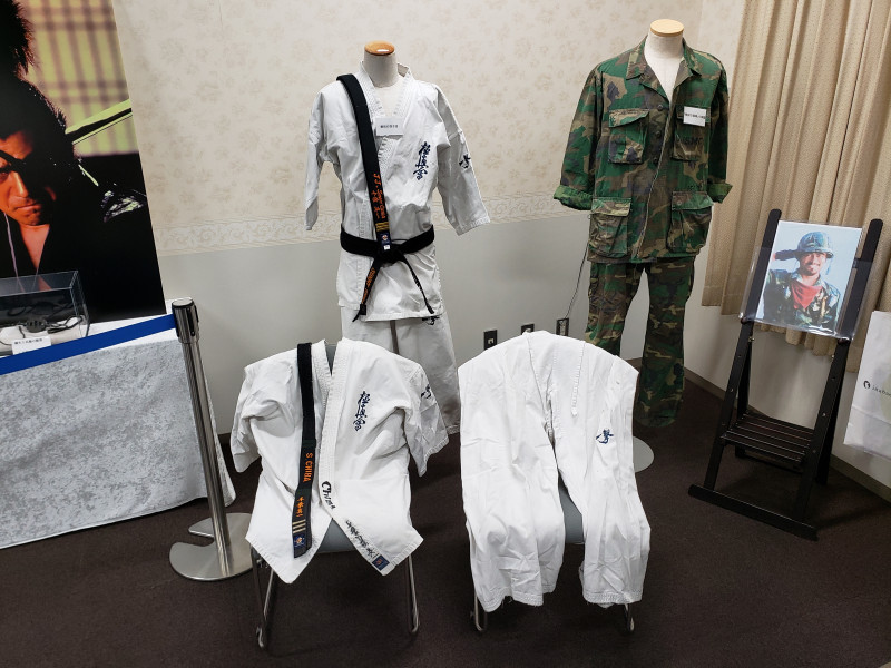 千葉さん愛用の空手着と戦国自衛隊の衣装が会場に展示