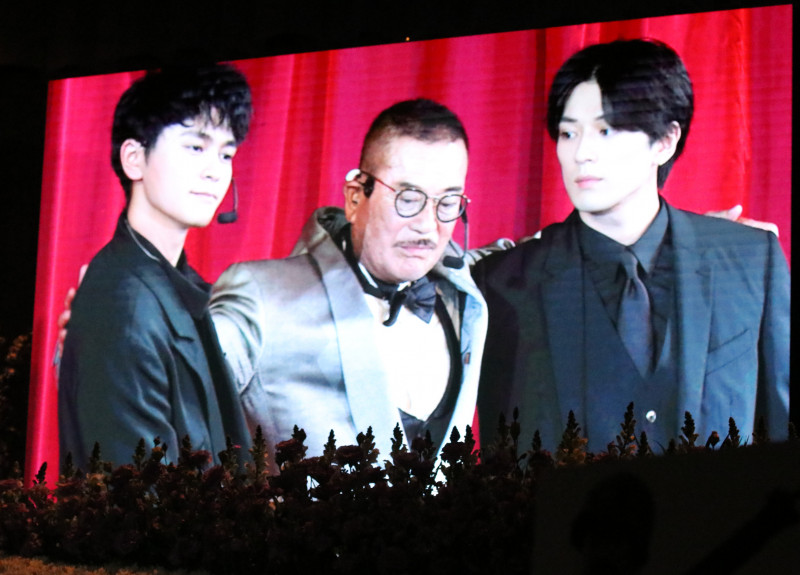 会場のワイドビジョンにて紹介された、父・千葉真一を中心に息子の新田真剣佑(右)と眞栄田郷敦(左)