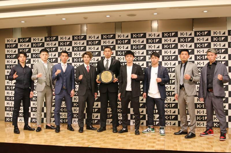K-1スーパー・バンタム級トーナメント参戦選手。(左から)金子、黒田、璃明武、一航(中央)中村プロデューサー(右から)内田、佐々木、鬼山、玖村