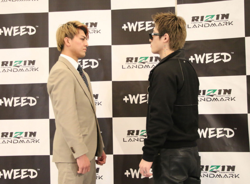 会見後、向かい合う平本(右)と鈴木