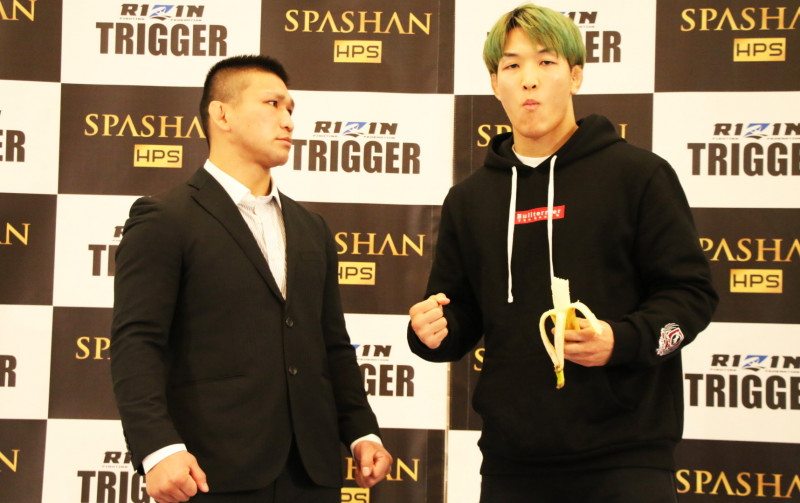 写真撮影で、バナナを食べながら挑発する鈴木(右)と睨みつけるアキラ(左)