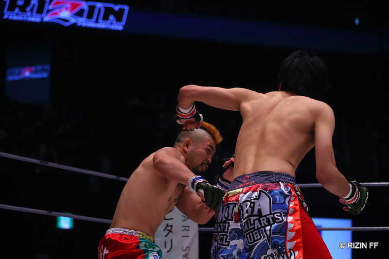 大原の強烈な左のパンチを被弾する渡慶次