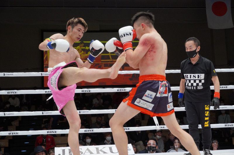一航の強烈なミドルで相手の肩回りが赤く染まる
