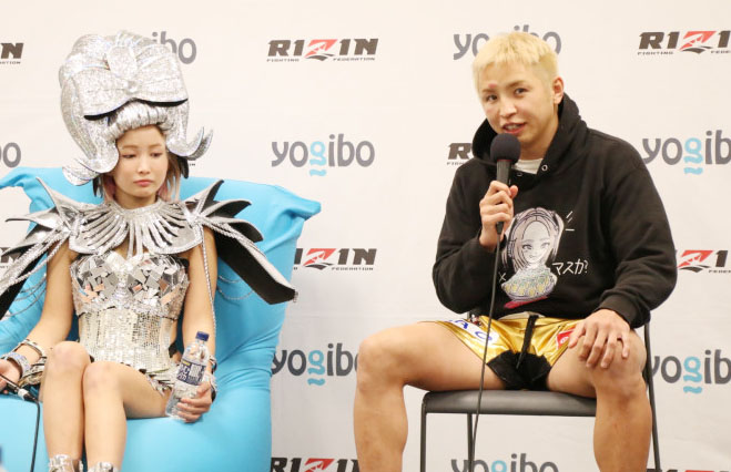 サラ夫人と久保優太=昨年大晦日、シバター戦の試合後会見にて