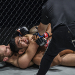 岡見のアゴにアバゾフの右ストレートがヒット
