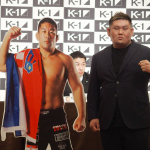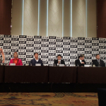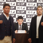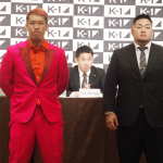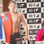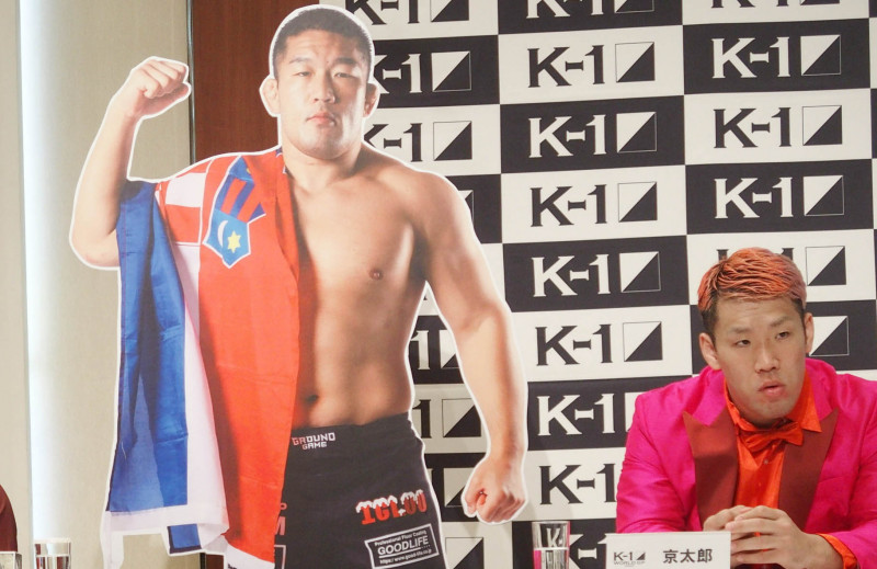 会見に欠席の石井慧のパネルと京太郎(右)