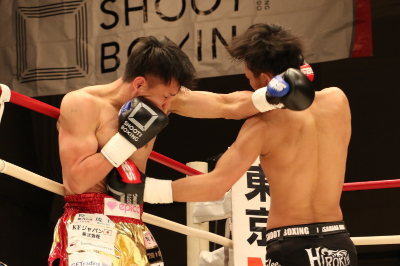 KNOCK OUT王者・スアレック(左)に強烈左ボディでKO勝利する笠原