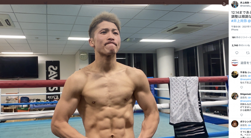 ジムでマッスルポーズの井上(21年11月・井上尚弥・拓真のマネージャーTwitter)