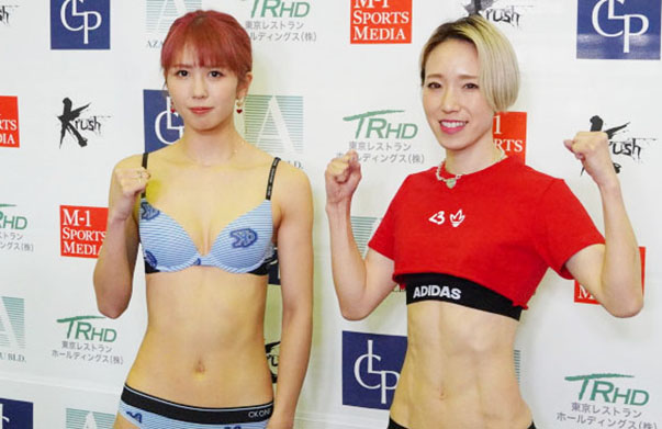 青ビキニの菅原美優(左)と優が計量で並ぶ