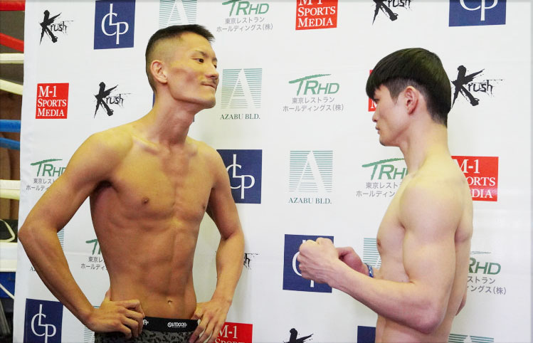 両者のバチバチフェイスオフ!アゴを上げ上から相手を見下ろす堀井翼(左)、明日、無事に試合が実現するか