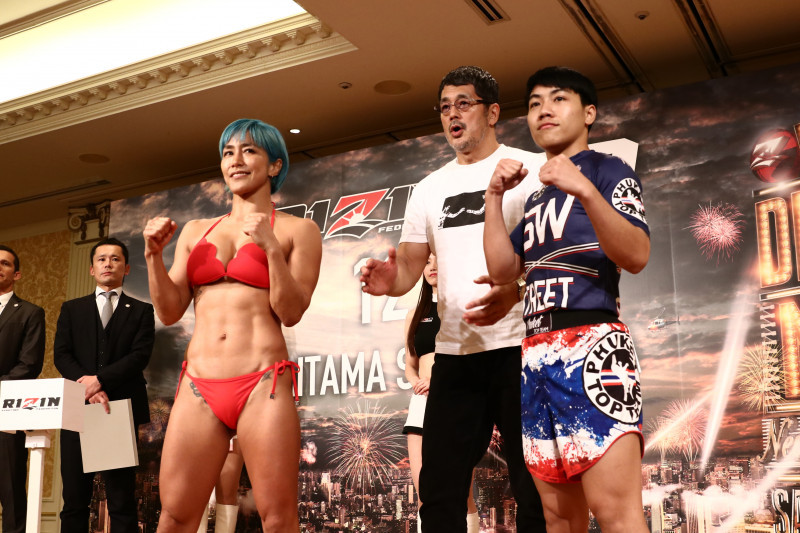 山本美憂(左)の計量ビキニ、菅原と練習しムエタイ王者に挑んだ19年大晦日戦の前日計量