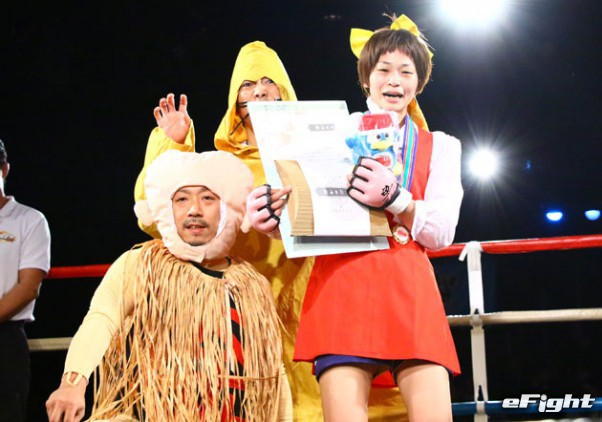 試合後、ネコ娘のコスプレで撮影をする北野(右/2017年12月)