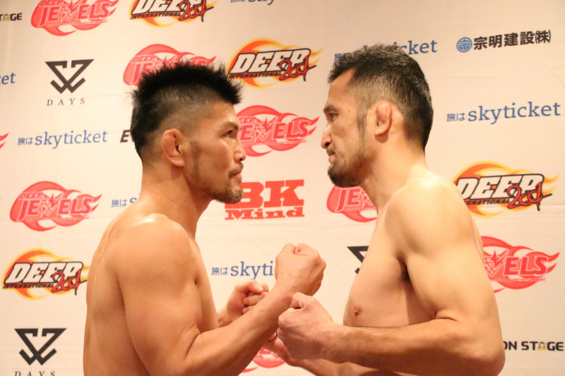 引退試合を前に気合いを入れる小見川。中村もフェイスオフに応じた