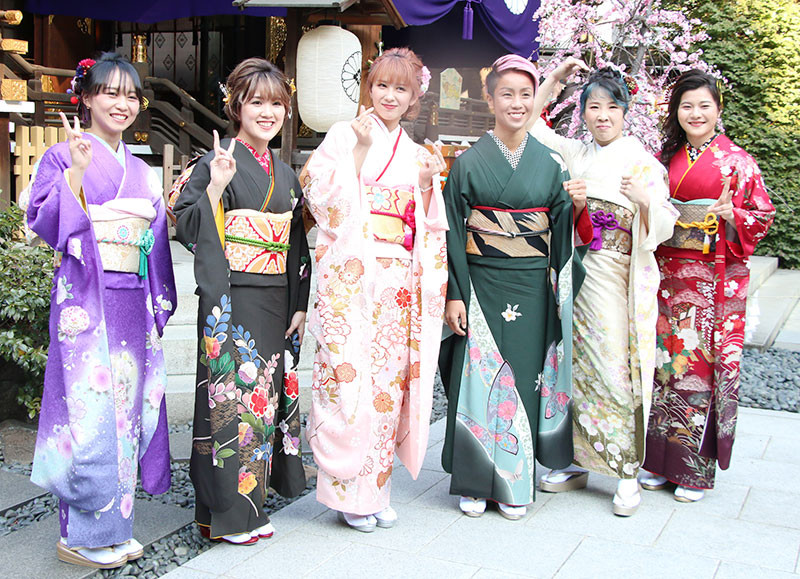 振袖姿で思い思いのポーズを見せた6人の女子選手