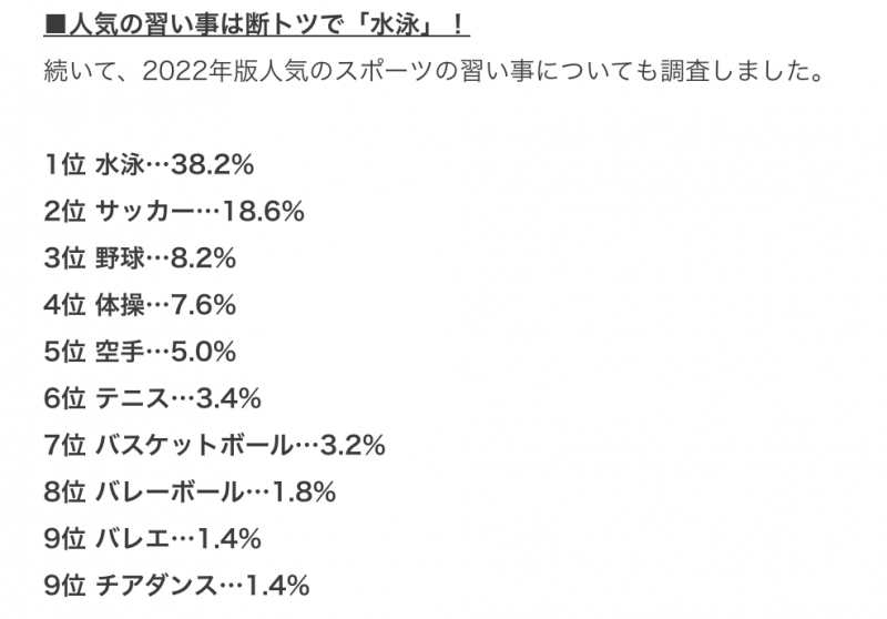 習い事の人気ランキング。10位以降には「卓球」「バドミントン」「柔道」「アイスホッケー」などさまざまなスポーツの名が並んでいる