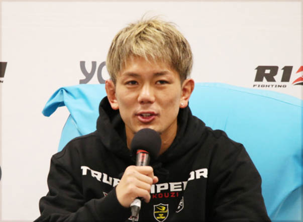 冬眠していた皇治が3.20大阪大会の参戦が発表された(写真は昨年おおみそか、試合後の会見で冬眠を発言)