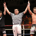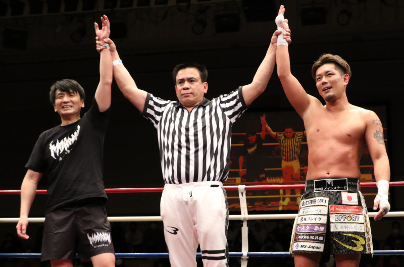 昨年2月、山口元気代表(左)とEXマッチを行った皇治(右)