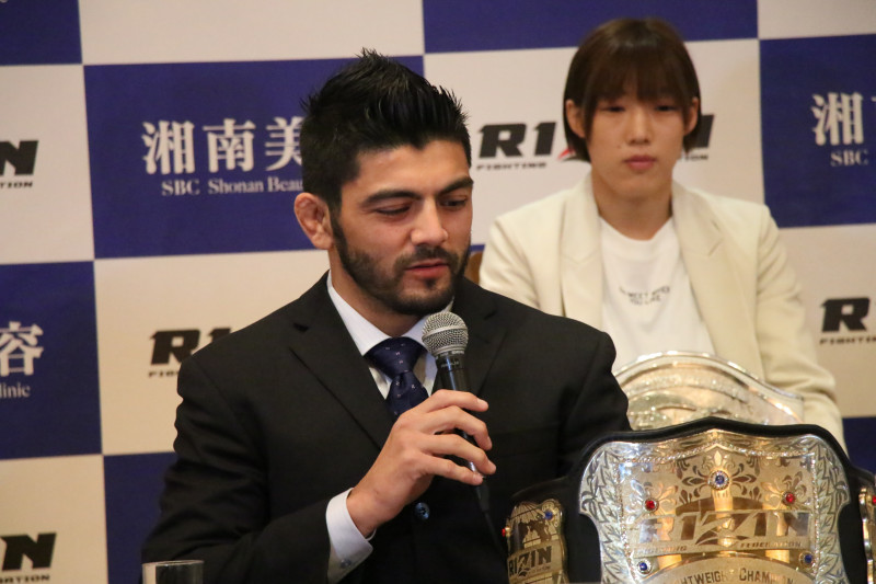 サトシは会見中にRIZINのベルトを愛おしそうに見つめた