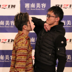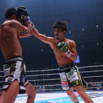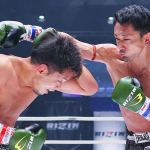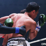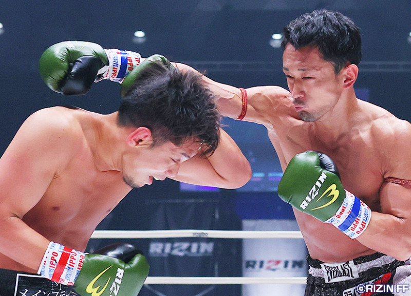 梅野のパンチをかわし接近戦に持ち込む皇治、これがバッティングにつながった