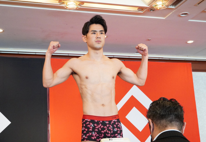 小笠原はマッスルポーズで計量をパス