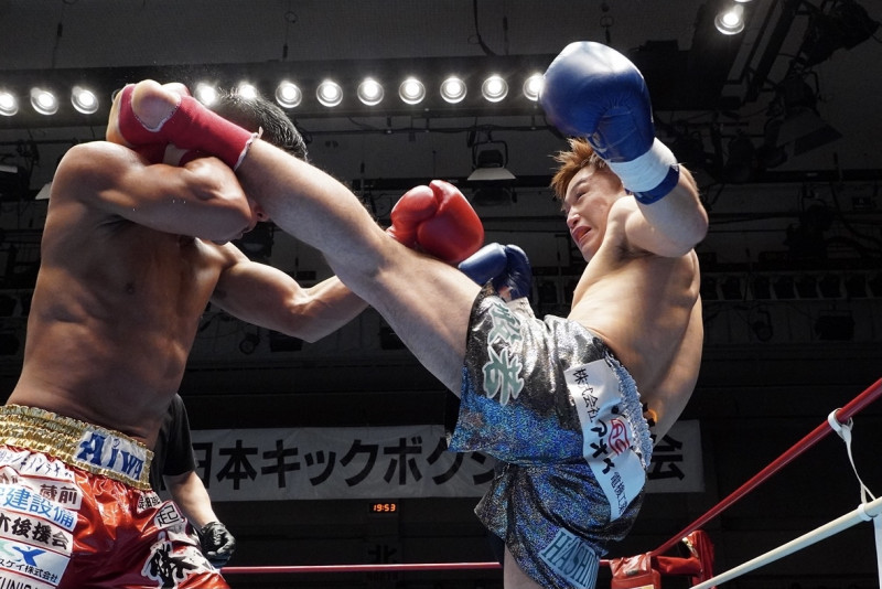 左のハイキックを蹴る般若HASHIMOTO