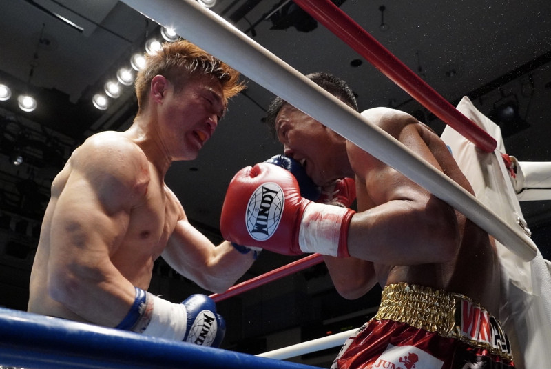 般若HASHIMOTO(左)がコーナーに勝次を追い詰める