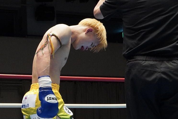 額をカットしたHIRO。切り裂かれた後、下を向くと血が滴り落ちた