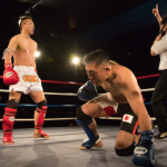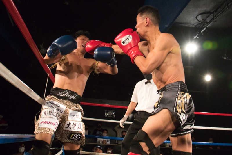 TOMO(右)の右ストレートがSHOJI(左)にヒット