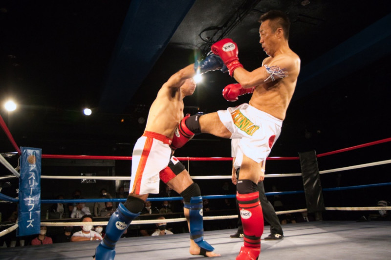 いっぱち(左)の右ストレートに右ミドルを合わせるkyonso(右)