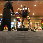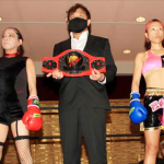 ”美魔女”森本は網タイツ衣装、大八木(右)は腹筋を見せる衣装でアピール
