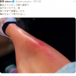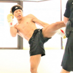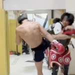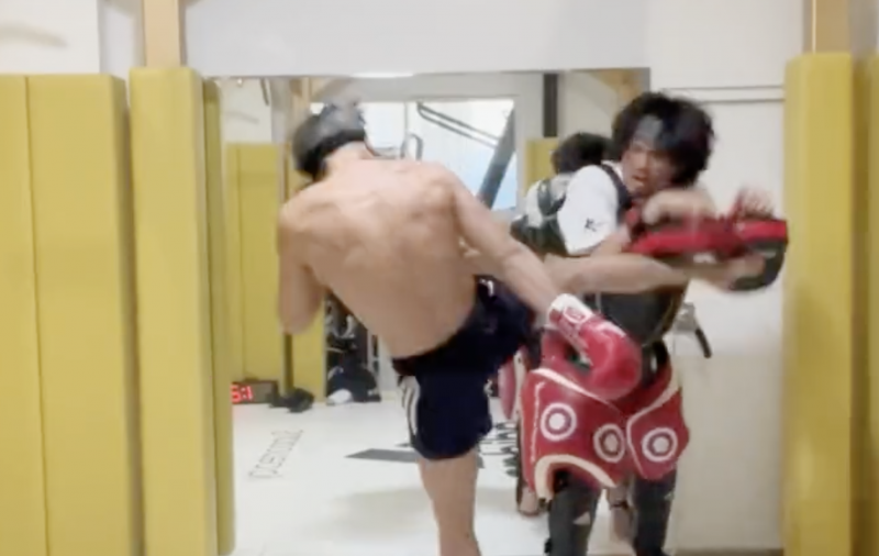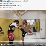 武尊の重い蹴りでミットがくの字に(武尊Twitterより)