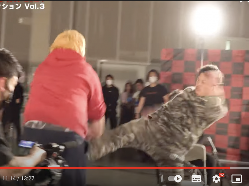 対戦決定にへずまが握手をしにいくと、てるが怒りの蹴り
