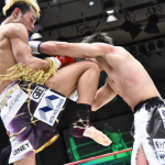 切れ味鋭いヒザ蹴りなど、一撃で倒せる破壊力を持つ池田(左)