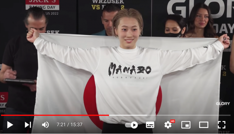 日の丸を掲げるポーズの愛三(GLORY公式YouTubeより)