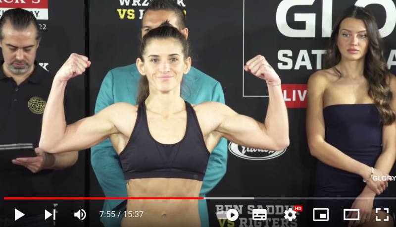 筋骨隆々のマッスルポーズを決める女王ヴァン・スースト(GLORY公式YouTubeより)