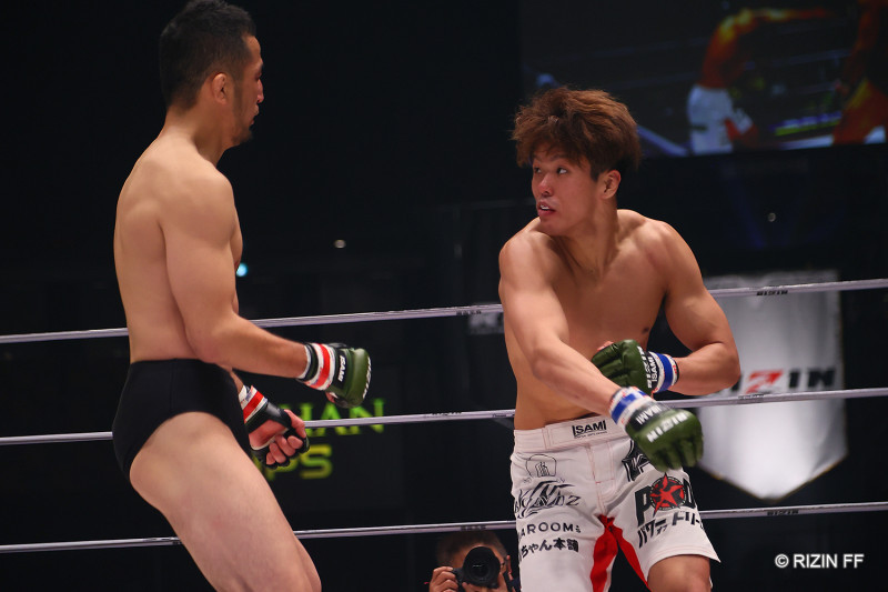 ノーガードで迫る中村(左)に、山本が全力のパンチを振るう