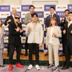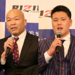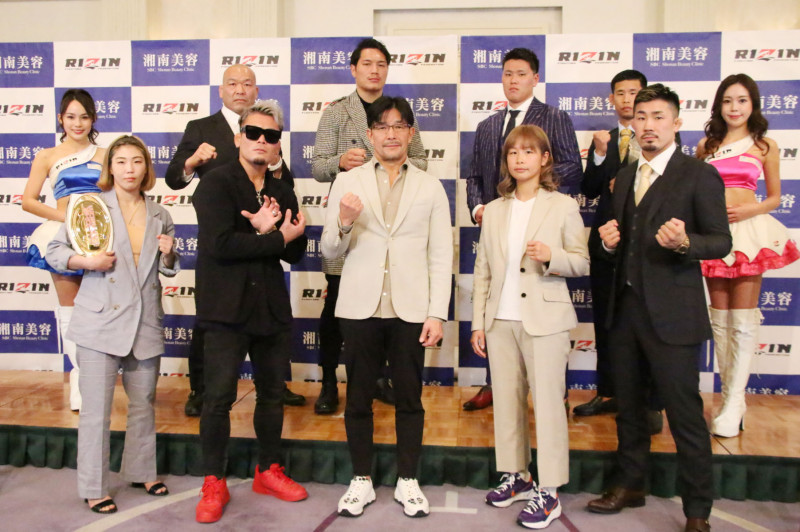 中央の榊原代表を挟み浅倉カンナ(右)と武田光司ら、本日参戦発表された選手たち